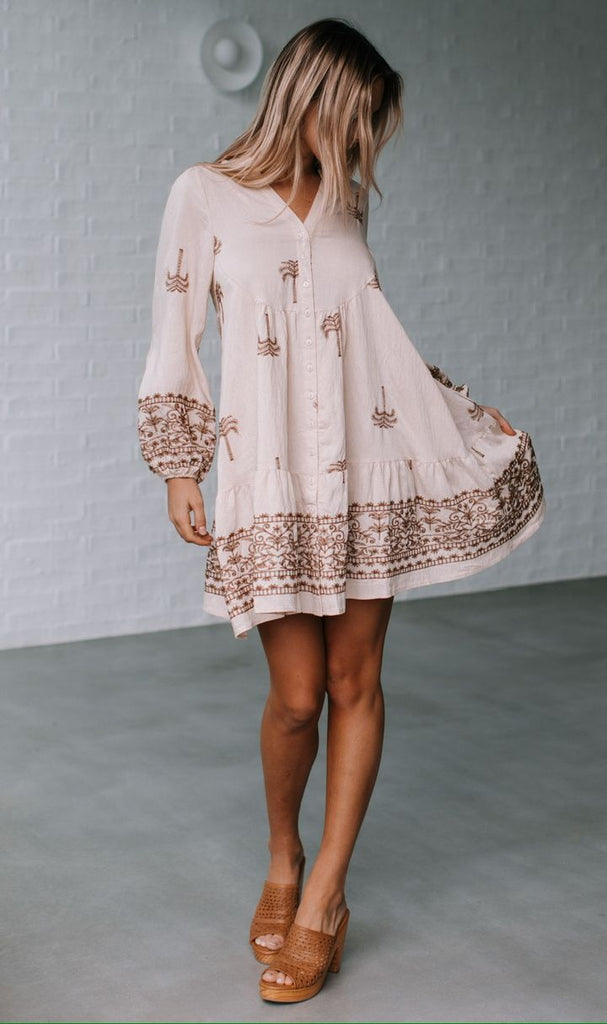 The Emelia Palm Dress is your springtime essential! With a loose smock fit, playful balloon sleeves, handy pockets at the hips, a soft cream color, and delightful embroidered Palm Tree details on the sleeves and hem, this dress is ready for all your sunny adventures.