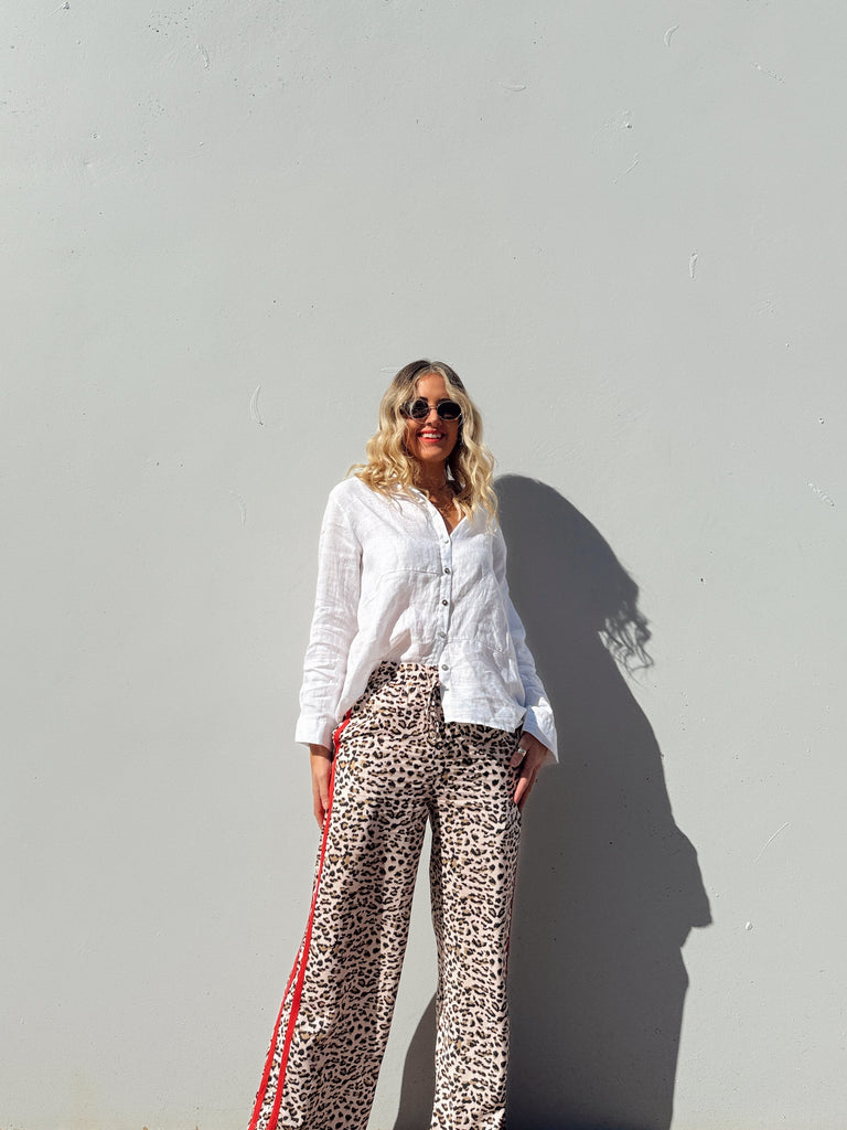 The Lennon Racer Pants feature a beige leopard print with an elastic waistband, handy hip pockets, and bold red side stripes. They’re perfect to wear with your favorite oversized Fisherman's Denim Jacket and trusty sneakers.